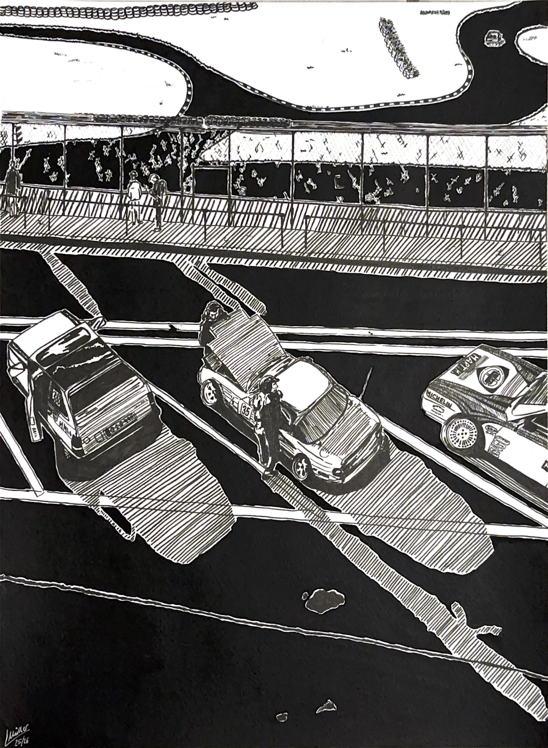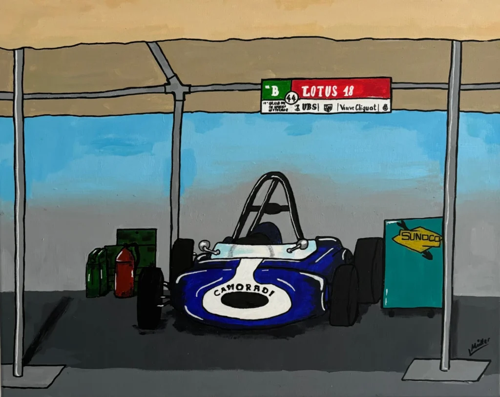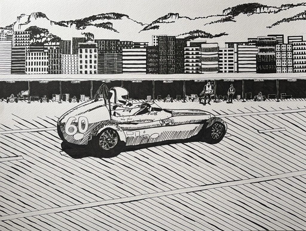Der Historic GP findet alle zwei Jahre vor dem F1 Rennen auf der gleichen Rennstrecke statt. Zugelassen sind originale, nicht modifizierte Grand-Prix-Rennwagen aus den Jahren vor 1985, darunter Vorkriegswagen, Frontmotor- und Heckmotor-Formel-1-Autos von 1930 bis 1985, entsprechend den damaligen technischen Reglements. Die Autos dieser Zeit sind Kunstwerke. Sie stammen aus einer Zeit, in der Autos Designer hatten, die neue Formen erschufen. Wunderschöne Formen und auffällige Farben, kombiniert mit Motoren aus beeindruckender Technik. Aber nicht nur die Autos sind beeindruckend, denn es herrscht eine unglaubliche Atmosphäre. Die Fahrer und Mechaniker der Autos lieben, was sie tun und das merkt man. Es sind offene, gesprächige Menschen, die Freude daran haben ihre Leidenschaft zeigen und auszuleben. Meine Inspiration zu der Zeichnung entstand im Fahrerlager, als ein Rennfahrer von der Strecke zurückkehrte und sich seinen Weg zurück in seine Box sucht. Eine Pause für den Fahrer sowie für das Auto. Das Auto ist ein roter Tecnica Meccanica-Maserati 250F. Sein Formel 1 Debüt hatte es mit 1959 mit dem Rennfahrer Fritz d‘Orey. Im Hintergrund ist die Stadt Monaco zu erkennen, davor sieht man die Fahrerlager mit den leeren oder gefüllten Boxen. Ganz im Hintergrund sieht man die Berge der Côte d’Azur.