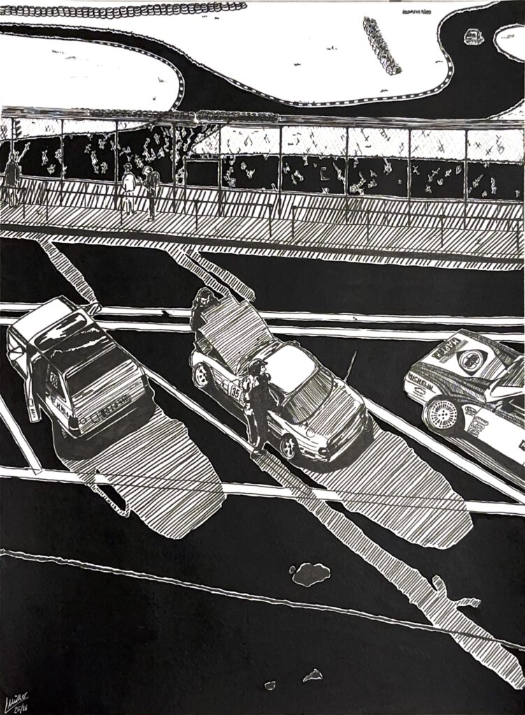 Besonders bemerkenswert ist die stilisierte Überzeichnung der Formen: Die breiten Kotflügel, die markanten Klappscheinwerfer und die Rennreifen zitieren die ästhetische Welt von Tuning und Motorsport, gleichzeitig jedoch mit einer Leichtigkeit, die fast cartoonhafte Züge annimmt. Diese bewusst überspitzte Darstellung führt zu einer Mischung aus Nostalgie und Dynamik – einem Gleichgewicht zwischen jugendlicher Freiheit und technischer Präzision.